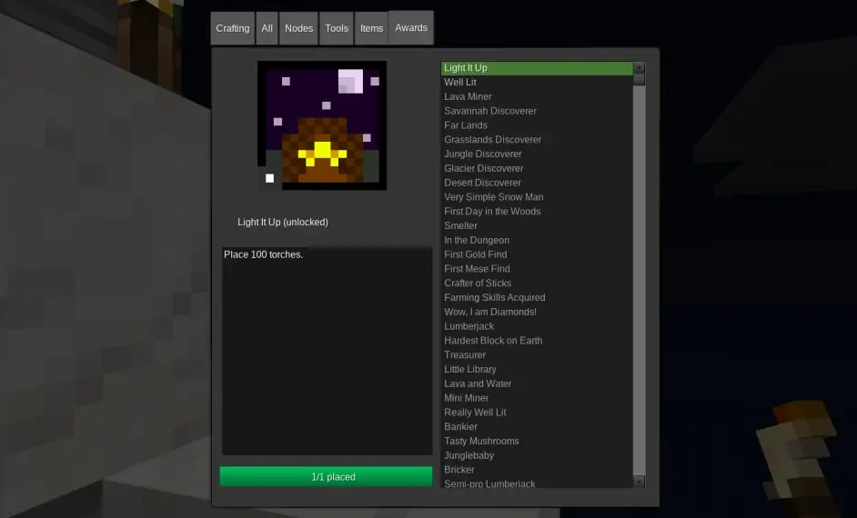 | 成就 | 讓玩家有目標。這個模組有提供一套API自訂成就,而內建的成就多半是以挖幾百個方塊為目標這類的。 | Awards | rubenwardy |