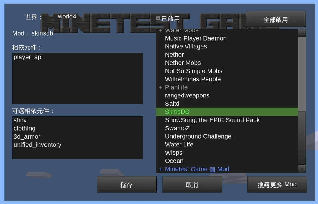 你可能會問說,模組是否適用於所有子遊戲?要看開發者怎麼寫,大部分的模組都是針對Minetest Game下去設計的,可能無法安裝到其他子遊戲。