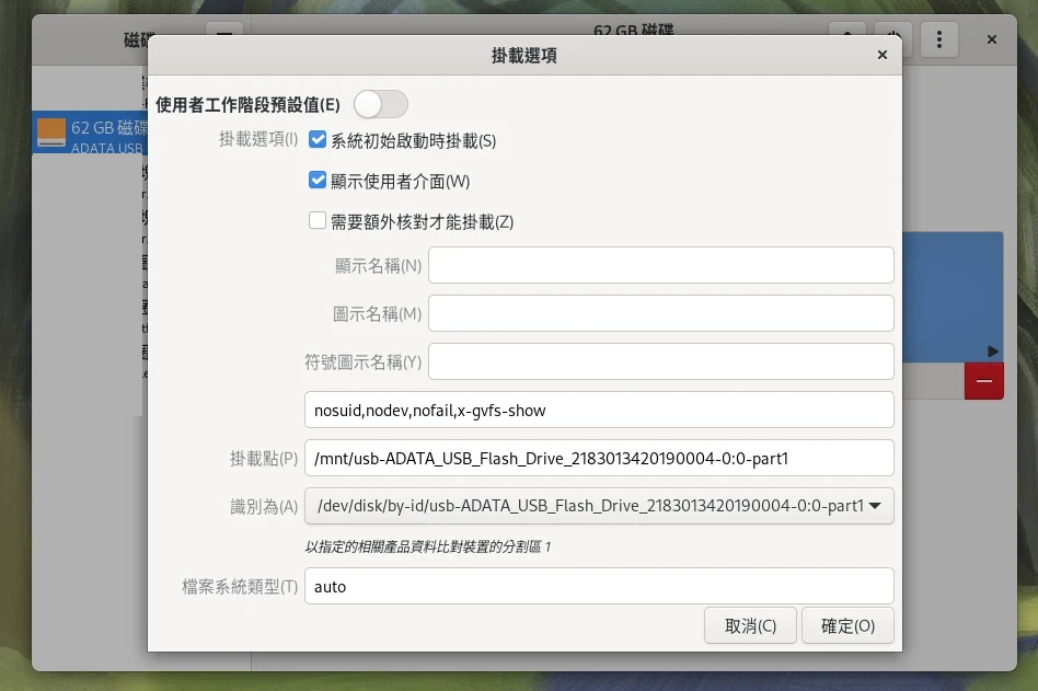 之後,你可以用GNOME的公用程式 → 磁碟(Disk)程式 → 編輯掛載選項,設定開機自動掛載NTFS硬碟。