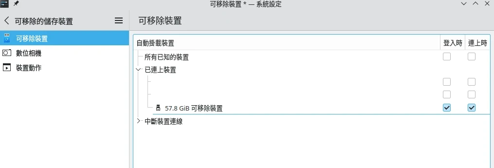 在KDE系統設定 → 可移除的儲存裝置,設定開機自動掛載NTFS硬碟。