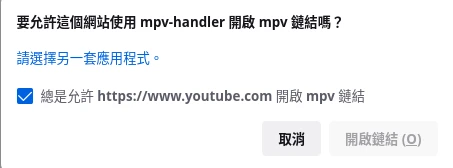 按下去同意開啟連結。(如果瀏覽器是Flatpak可能會跳出XDG Portal,此時請嘗試選取mpv-handler)