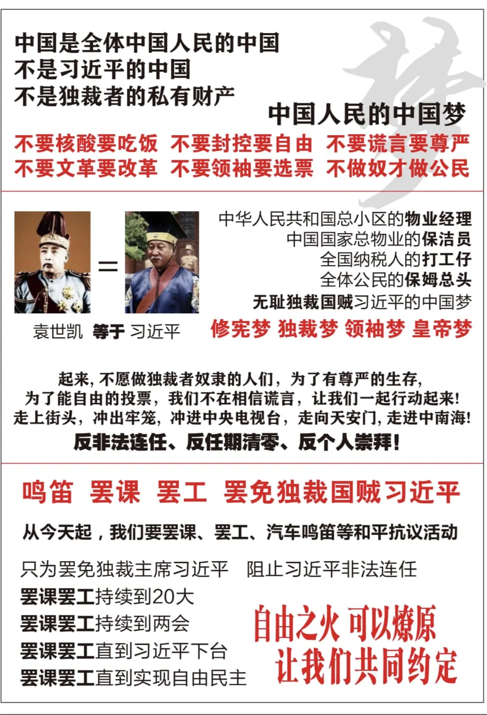 現在我要大聲的說:不要謊言要尊嚴,不要文革要改革,不要領袖要選票,不做奴才做公民。獨裁者習近平,下課。