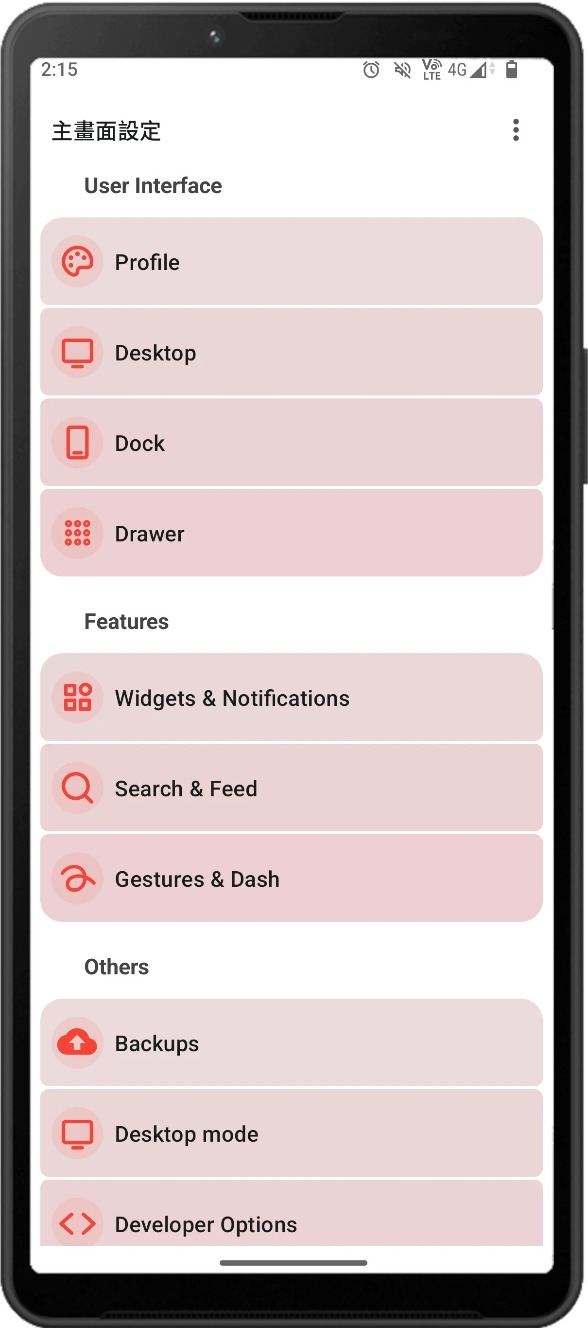 可自訂的界面。顏色、圖標形狀、透明度都能自訂,也能自訂桌面手勢滑動要觸發的操作。桌面模式(Desktop Mode)我不確定有什麼用。