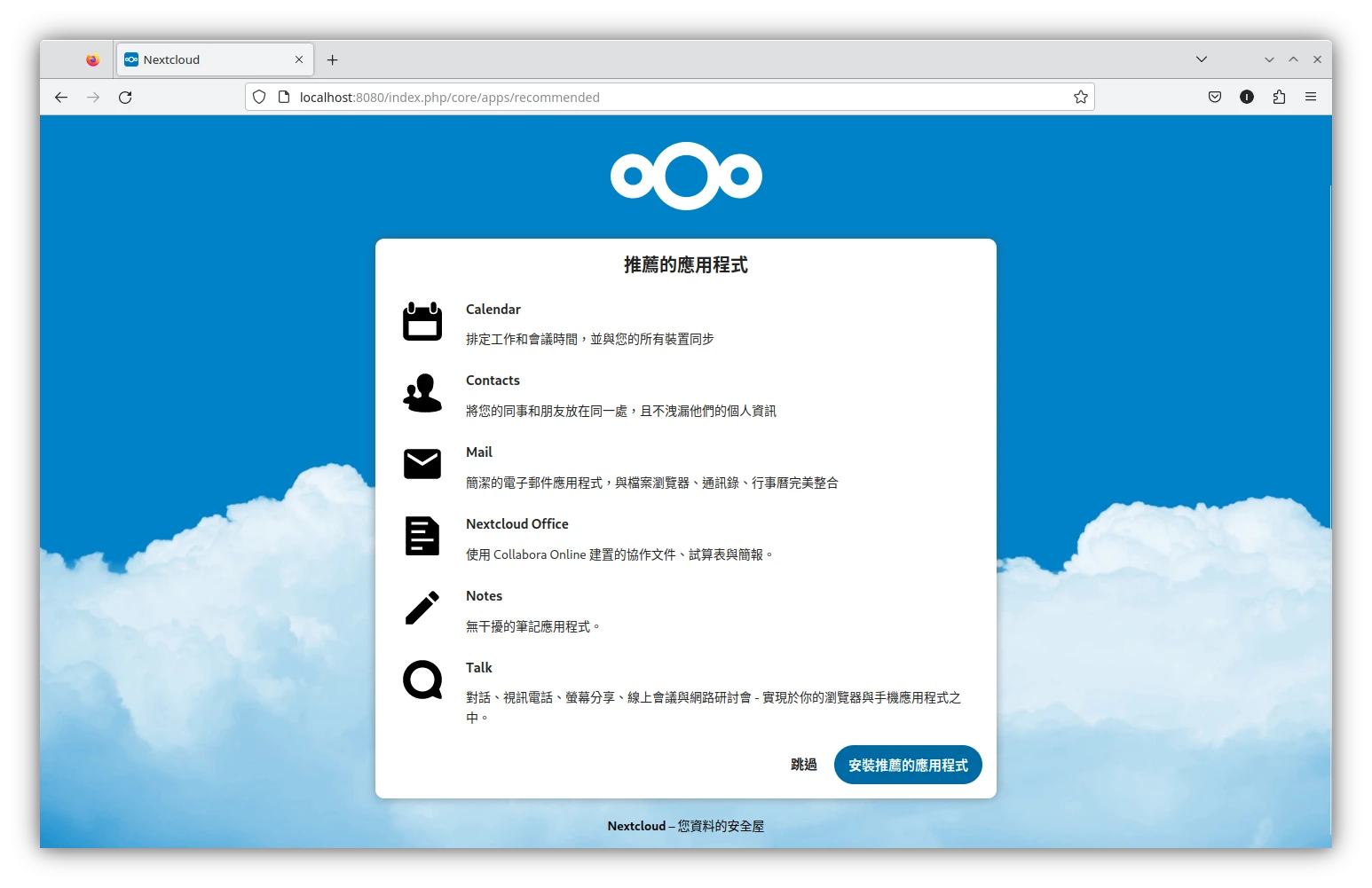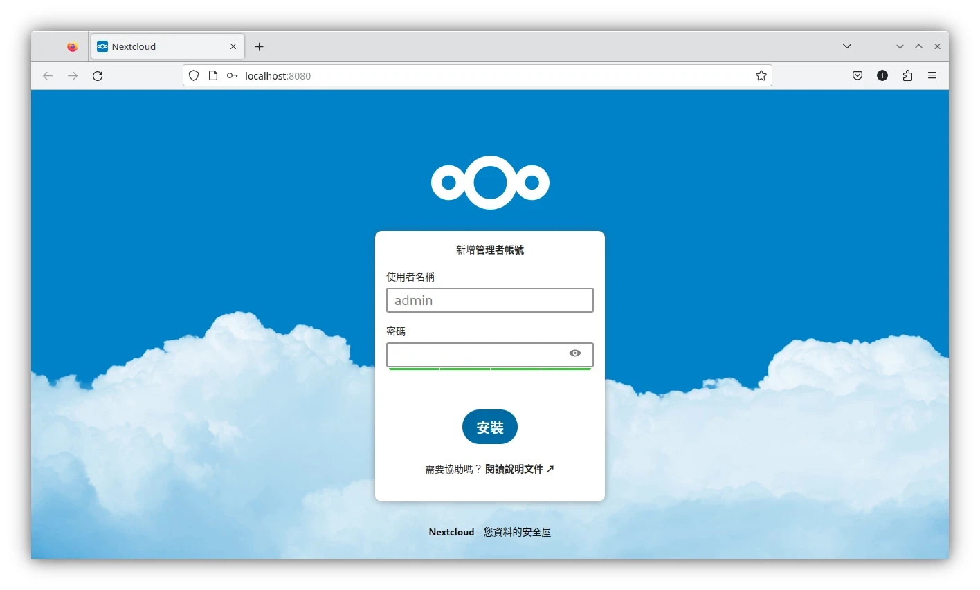 http://電腦的ZeroTier IP:8080連線至Nextcloud雲端了。