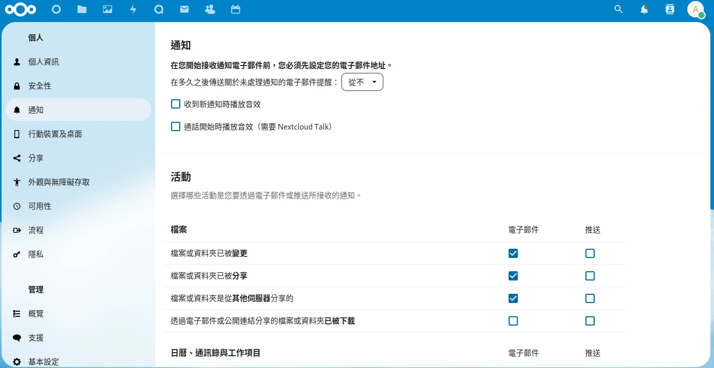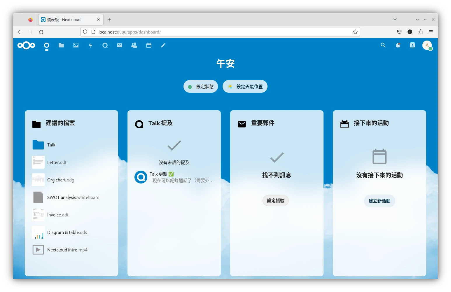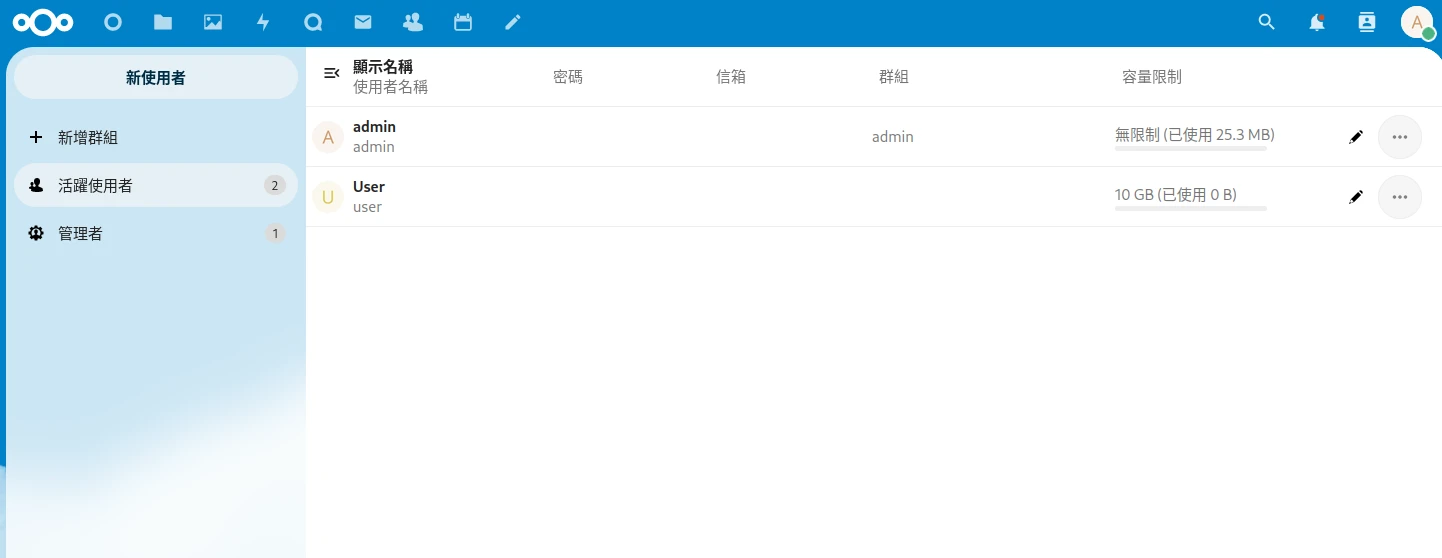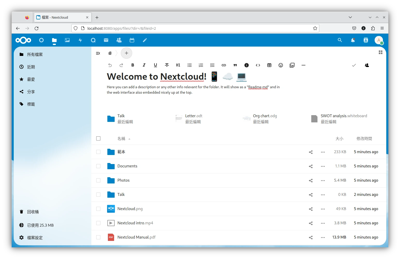 完成,你可以開始使用Nextcloud了。點選左上角「檔案」進入雲端硬碟。