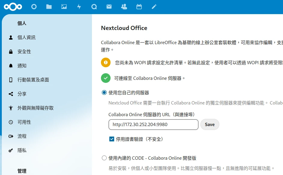 http://172.30.212.199:8080,不要用http://localhost:8080點選管理設定 → 個人資訊 → Nextcloud Office,設定「使用自己的Collabora Office伺服器」,IP填入
