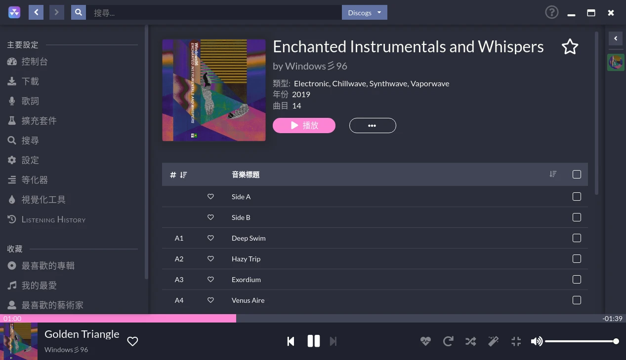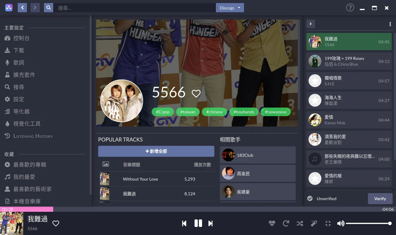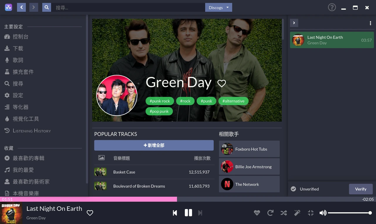 因為Nuclear Music Player使用discodogs搜尋,對英文歌支援較好,比較容易找到完整的的作品集。比如我搜尋Green Day,就會有熱門歌曲和歷年專輯列表。