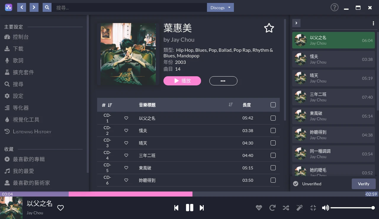 相較於英文歌,中文歌雖然打中文名字還是找得到,但是哩哩啦啦,常常找到「音軌」(影片純音訊),難以找到專輯。