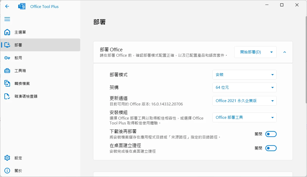 你也可以改在「部署」頁面詳細指定要下載的Microsoft Office版本、位元、架構。