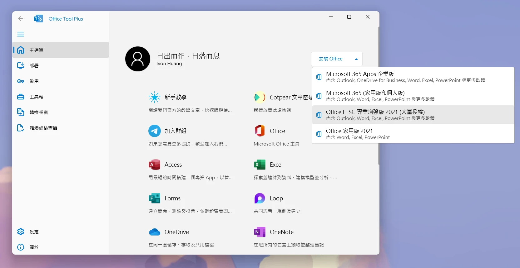 Office Tool Plus為中國開發者Yerong開發的免費軟體。沒有開放原始碼,風險自負(Github上只有翻譯檔)。