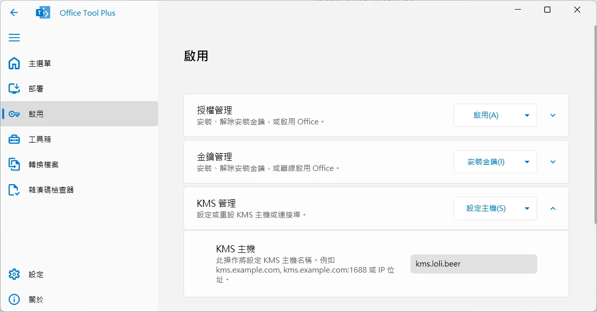 你可以透過統一的面板管理Office授權。如果你有購買Office金鑰,或是學校企業機關有提供線上KMS啟用,那麼這個工具能夠協助你輕鬆啟用Office產品。