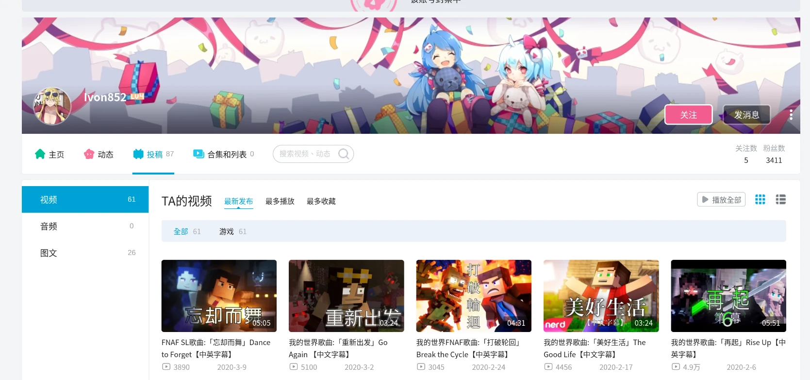我專注的影片類型是Minecraft歌曲,包含原創和Minecraft Parody,後者的創作形式始於CaptainSparklez在2013年的一首"Creeper? Oh man"讓這樣的創作遍地開花,到現在還是有很多後起之秀。分類有:parody,即像"Revenge"翻唱自著名歌曲再配合動畫;還有些歌是樂團專門為Minecraft動畫所寫的,例如Minecraft Jams的團隊會製作動畫,還會寫歌。