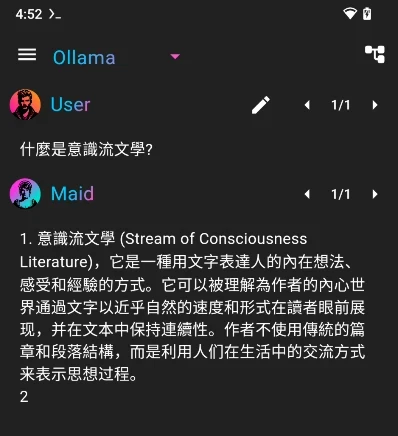 有很多Android APP相容Ollama API,例如JHubi1/ollama-app或者Mobile-Artificial-Intelligence/Maid,這些APP能當作Ollama前端使用。下面以Maid為例。