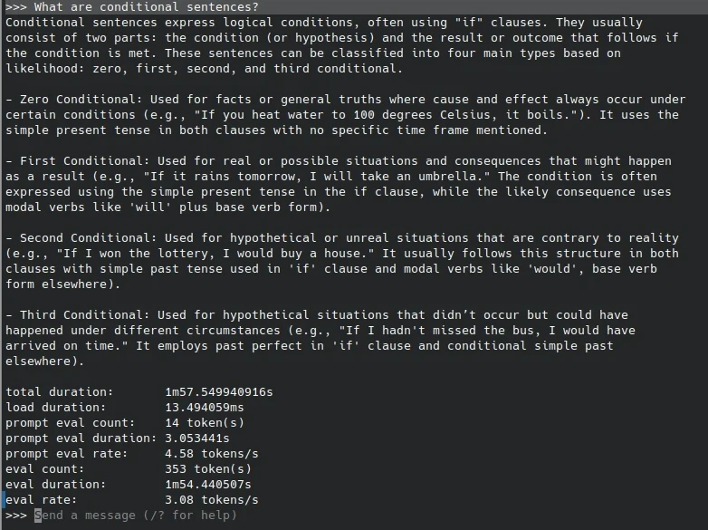 我們以Ollama指令進入純文字對話模式,測試生成速度: