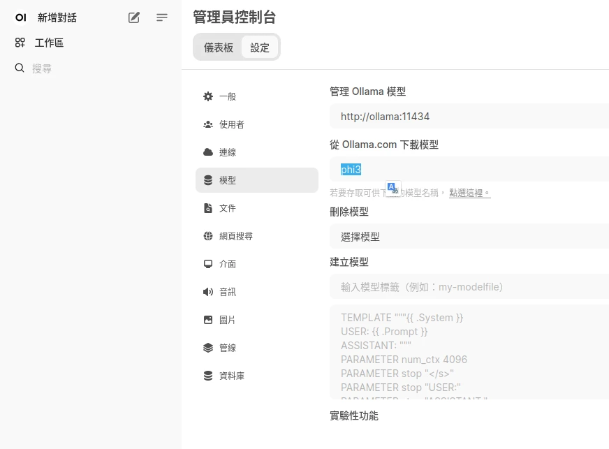 http://樹莓派IP:3000登入Open WebUI我們再從Open WebUI的管理員控制台下載模型,考慮到性能,選擇Microsoft Phi-3。