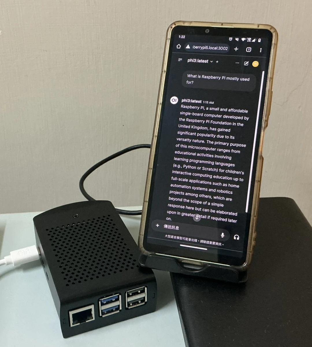 如下圖,在Raspberry Pi跑語言模型,並透過手機瀏覽器與之互動。