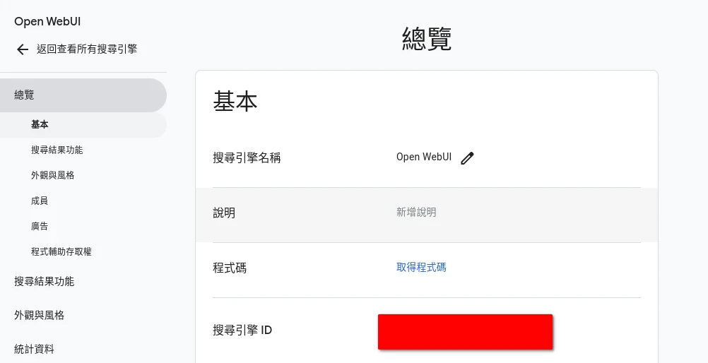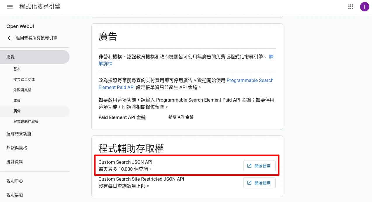 至於最受歡迎的Google嗎,Open WebUI沒辦法直接存取,你得自行建立「Google程式化搜尋引擎」取得API金鑰。這個搜尋引擎有限額,一週僅限搜尋1000次。