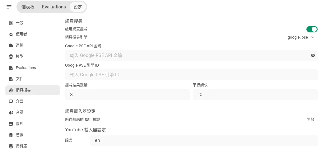 開啟Open WebUI,點左下角開啟管理員設定面板,在網頁搜尋設定使用Google PSE,填入搜尋引擎ID與API金鑰