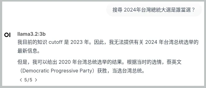 例如,你問LLaMA語言模型:「2024年台灣總統大選是誰當選?」他會說他的記憶還在2023年以前,所以不能給出答案。