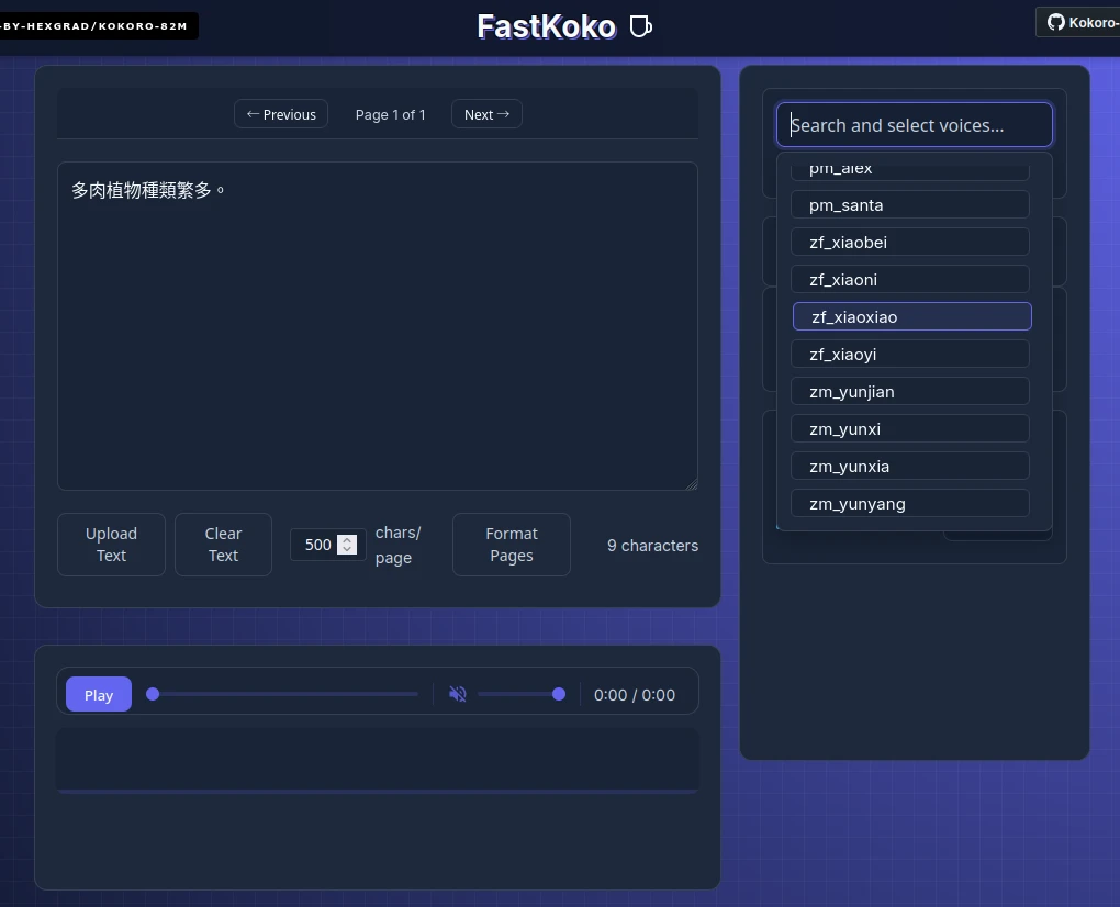 http://localhost:8880/web,嘗試進入Kokoro的網頁界面,查看可用語音。因為使用OpenAI端點的格式通訊,Open WebUI端沒辦法指定語言,所以得從這裡記住中文語音的名字,例如zf_xiaoxiao是中文女聲。