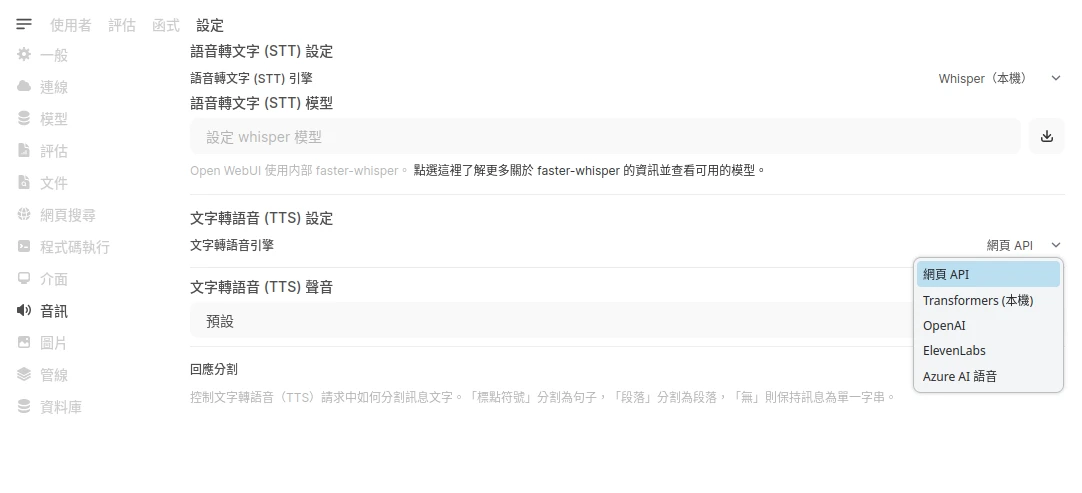相較於語音轉文字(STT)只有Whisper AI一種選項,Open WebUI文字轉語音(TTS)支援的服務非常多元。