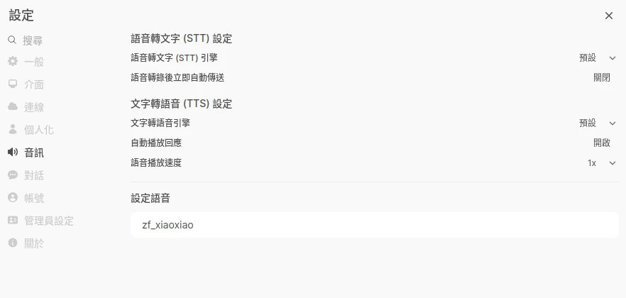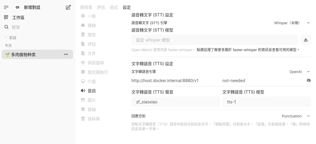 對話時點選Open WebUI的設定 → 音訊,可以開啟生成文字後自動唸出對話的功能。