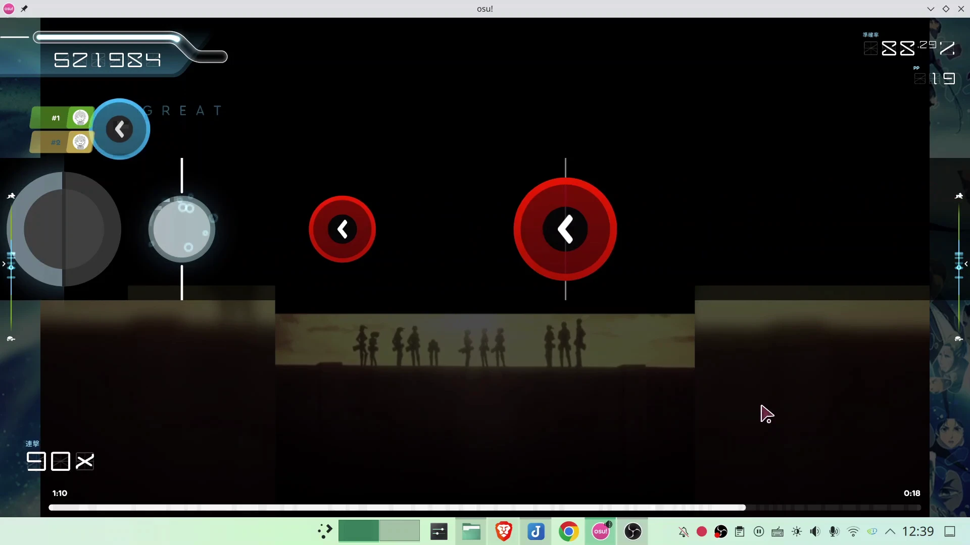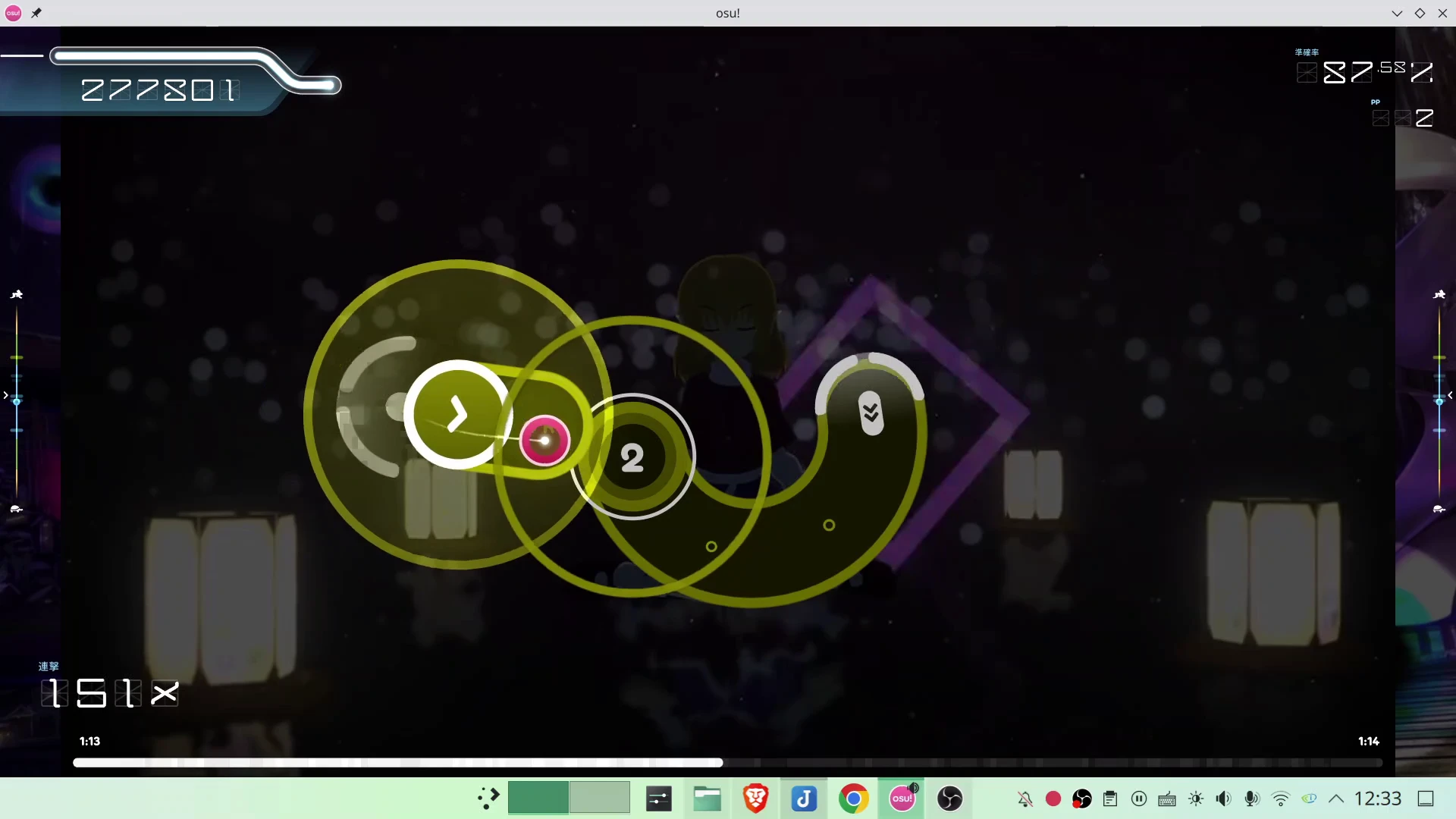 譜面的元素移動過快的時候,X11很容易出現畫面撕裂感,即使開全螢幕也是一樣,我很確定不是驅動問題。Wayland不會。據說Wayland環境比X11更容易造成點擊延遲,我自己感覺是沒有。