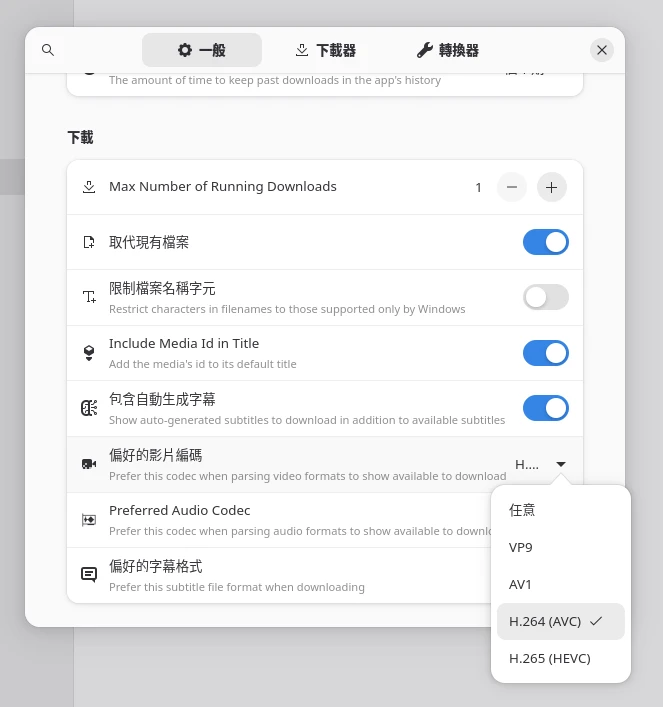 在下載之前…先確保編碼問題。目前Youtube高畫質影片大多採用AV1編碼,較老的影片播放器可能會黑螢幕。如果你電腦使用的影片播放器不支援新型解碼器,建議開啟Parabolic左上角的編好設定 → 一般設定,將影片編碼切換為H.264,確保下載後的影片在大多數裝置都能播放。