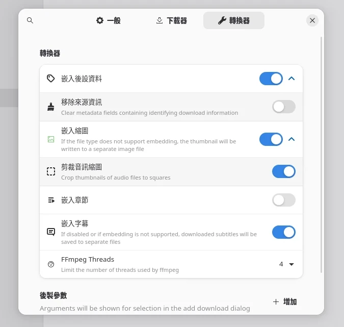 如果你需要自訂進階後處理規則,可以在Parabolic的設定 → 轉換器裡面新增後製參數預設集,這樣下載的時候才會出現在選項卡。