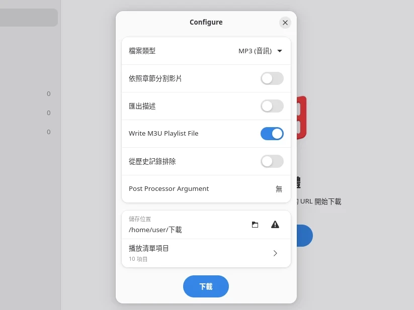 下載格式選.mp3(相容性最好)或.m4a(Youtube原生格式),因為Youtube音質頂多到256kbps,沒有必要選FLAC無損格式。M3U清單這個是讓音樂播放器辨識用的,除非你要下載的播放清單沒有演出者資訊,或者不是屬於同一張專輯,不然音樂播放器軟體應該都能自動辨認影片。