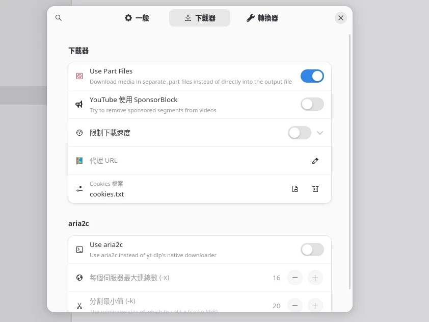 針對需要特殊處理的影片,Parabolic也允許串接yt-dlp自訂指令參數,ffmpeg自訂指令參數幾乎全部圖形化。