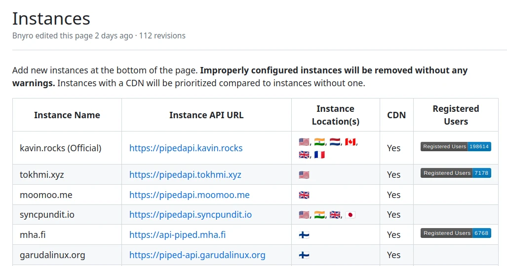 全球有採用Piped技術的網站,稱為Piped實例(instances),比如Piped的官方實例就是https://piped.kavin.rocks。