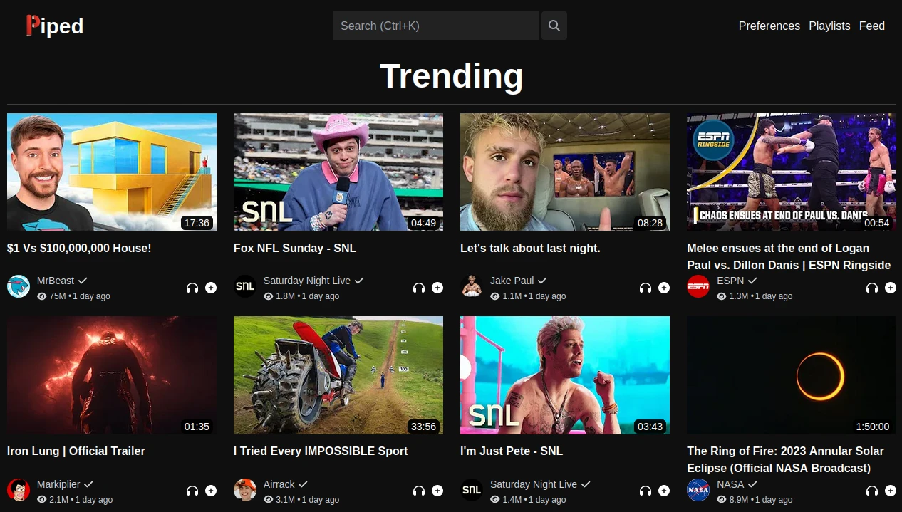 進入Piped主界面,會顯示該實例所在位置的熱門影片。