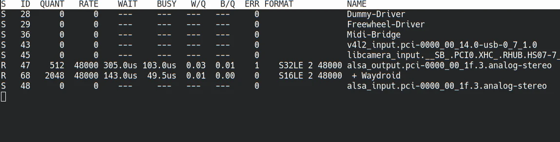 pw-top指令查看,儘管Apple Music可以有192kHz輸出(ALSA),但Waydroid輸出到Linux端的音訊取樣率最高只有48Hz(Android SRC本身的限制),最起碼這樣也是有符合保真壓縮音訊的標準啦。