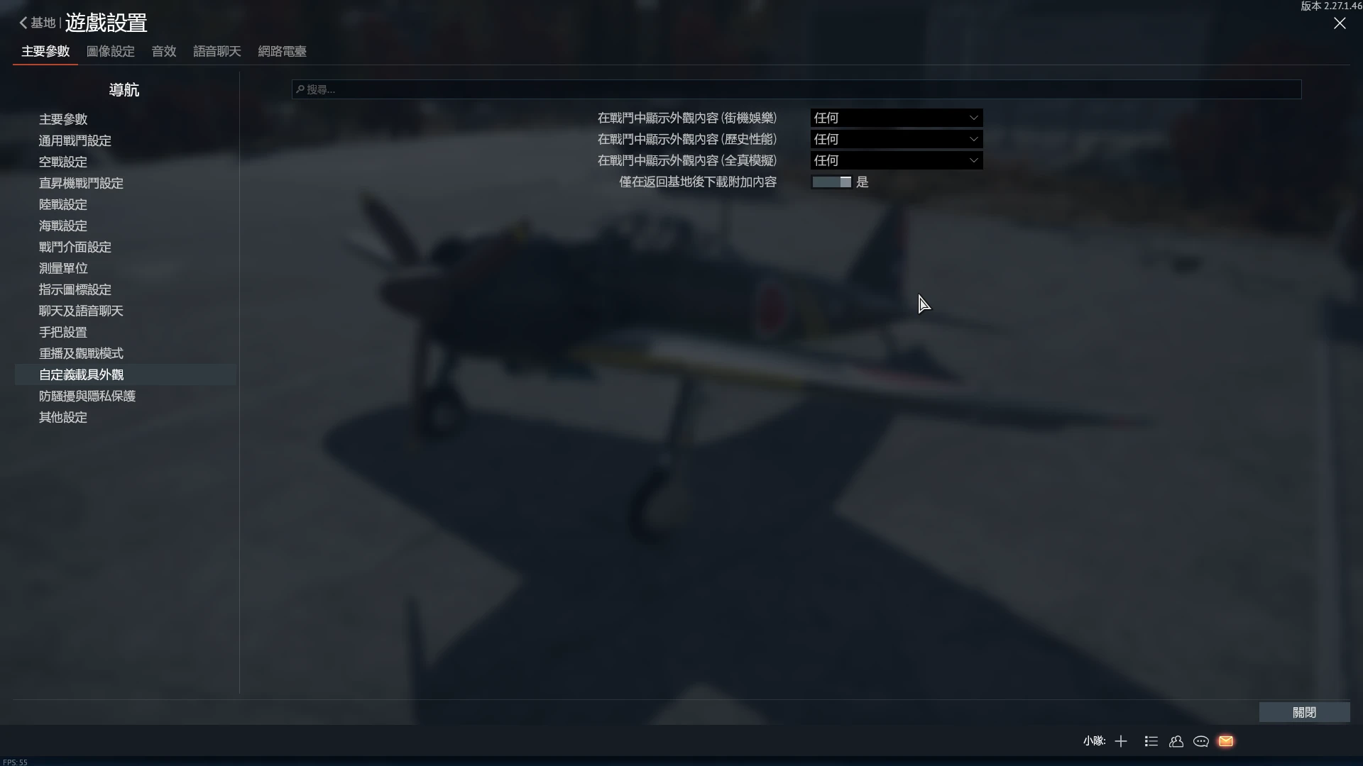 重新啟動戰爭雷霆,到遊戲設定勾選「啟用虛構外觀」