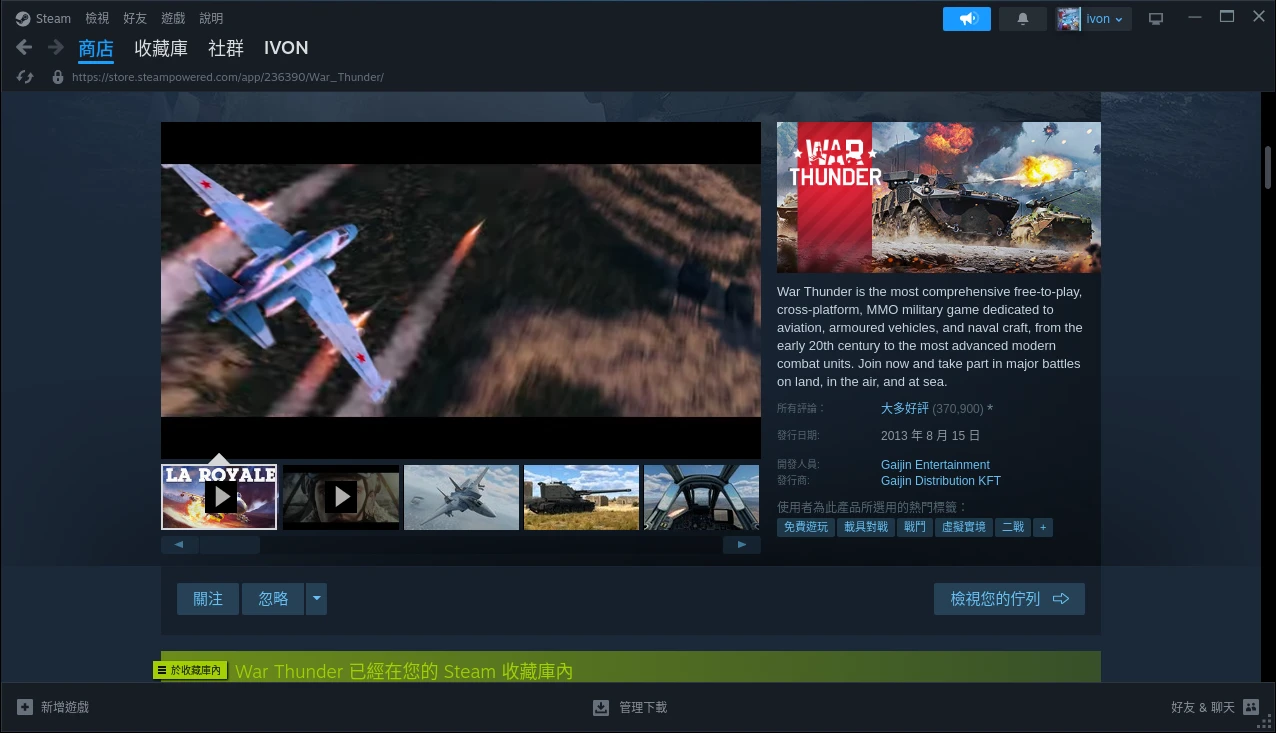 戰爭雷霆War Thunder在Linux平台主要有三種安裝方式,Ivon推薦透過Steam安裝,運作比較穩定,也方便管理更新與成就。