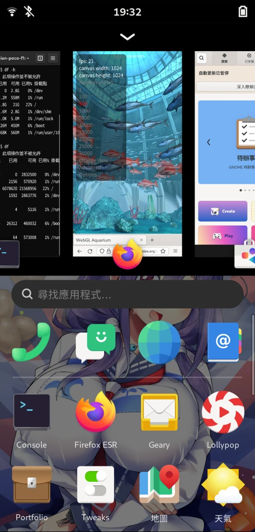 但是Phosh的桌面環境不適合跑桌面APP,因為Phosh會把每個視窗都當作一個APP處理,最好另外安裝GNOME桌面環境。