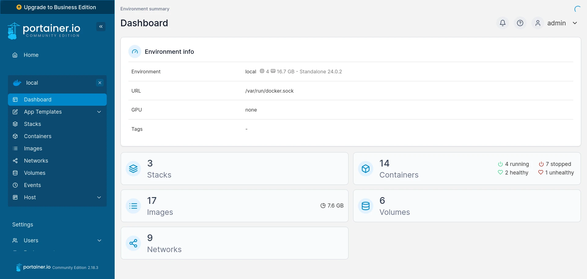 主畫面面板即會顯示本機的容器服務狀態,包含本機映像檔、執行中的容器、Stacks(Docker-compose)資訊。
