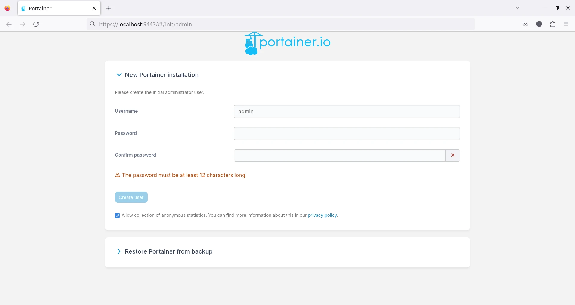 https://localhost:9443,進入Portainer管理界面(注意是HTTPS,Portainer有自簽SSL憑證,點選允許不安全的連線),註冊一個admin帳號。