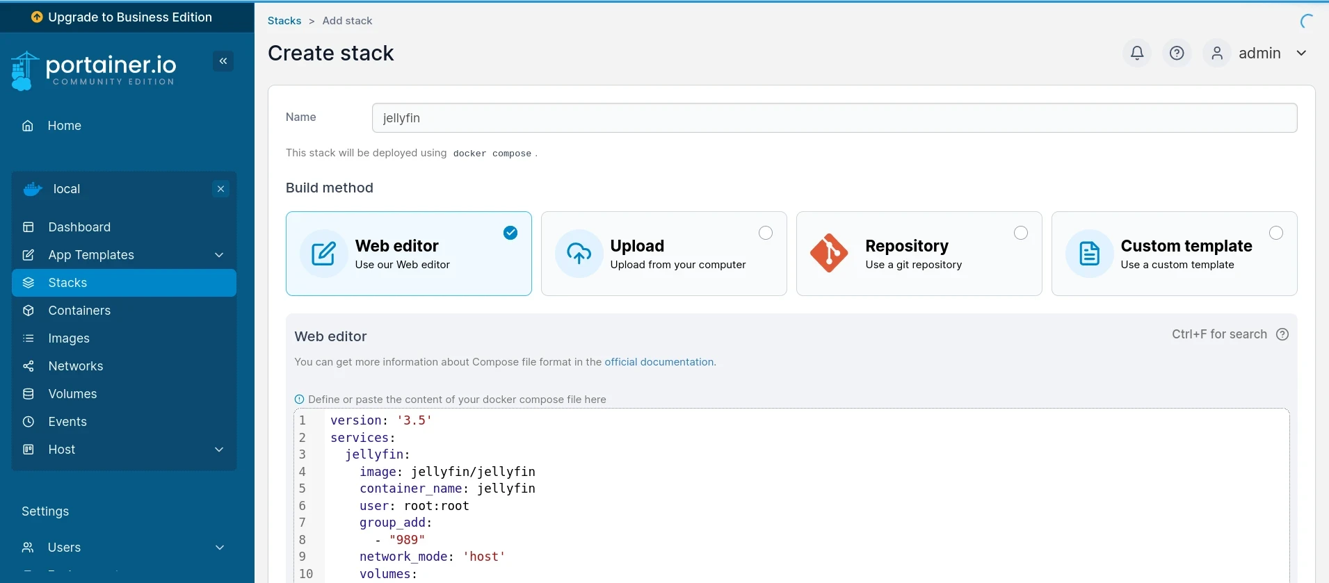 「Stacks」頁面就是管理docker-compose的地方,我認為這是Portainer最方便的功能,光這個界面就能用網頁寫好多個docker-compose.yml再立即部署。