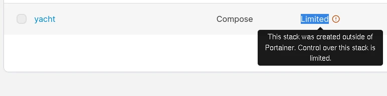 在安裝Portainer前就已經啟動的docker-compose容器,Portainer對其的控制權限會受限(Control: Limited)。您必須先用docker compose down指令關閉,再轉由Portainer啟動容器。