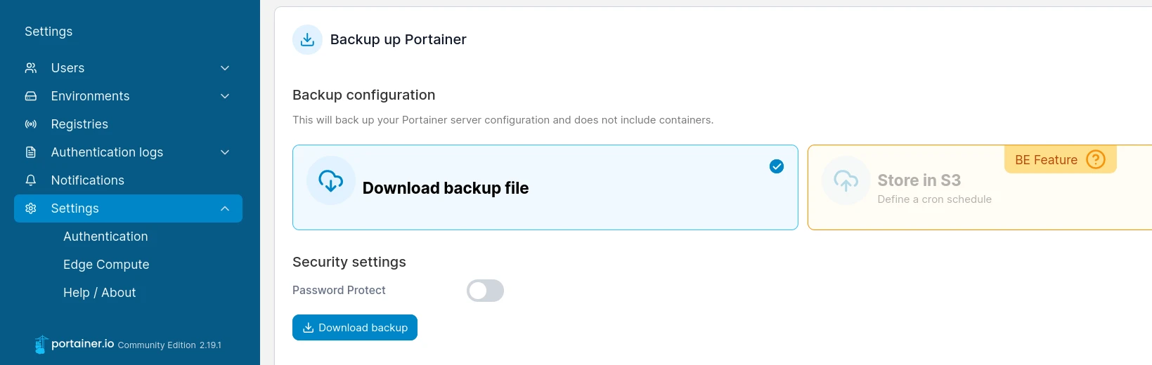 要備份Portainer的資料,在網頁界面點選左側的Settings,按Download backup file,存成壓縮檔,這樣重裝的時候就可以還原。