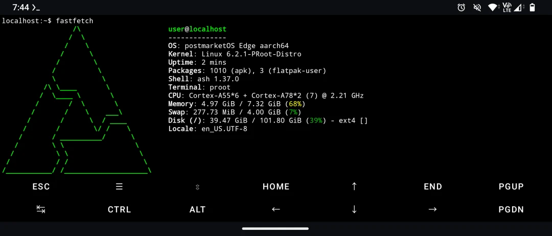 我採取非官方認可的縫合怪做法,透過Termux Proot跑postmarketOS系統,讓我們可以體會一把手機上的Linux系統長怎樣。