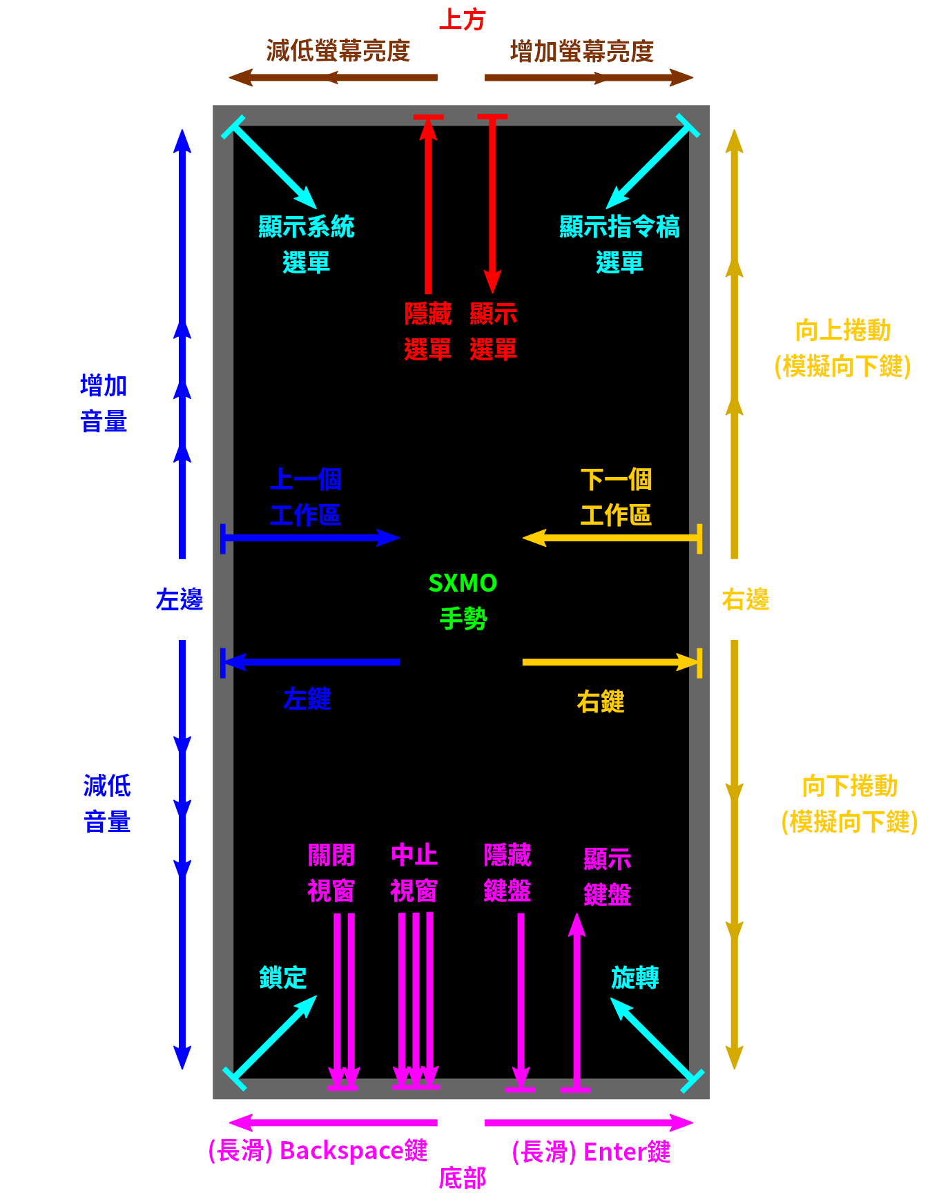 接著還要記一些常用的手勢,箭頭代表手指的數量。若手機有圓角邊框,邊邊的觸控手勢可能就會很難觸發。(改繪自SXMO USERGUIDE)