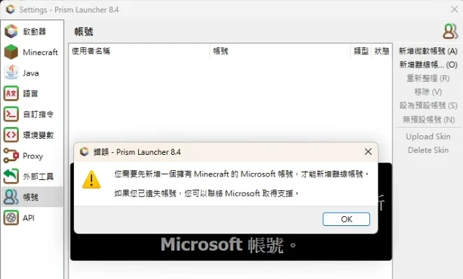 首先開啟Prism Launcher一次,點右上角管理帳號,Prism Launcher會要求新增Microsoft正版帳號才可以新增離線帳號。