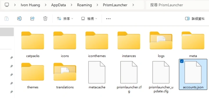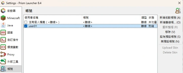 儲存檔案。重開Prism Launcher,就會發現右上角顯示離線帳號(黑白史蒂夫頭)