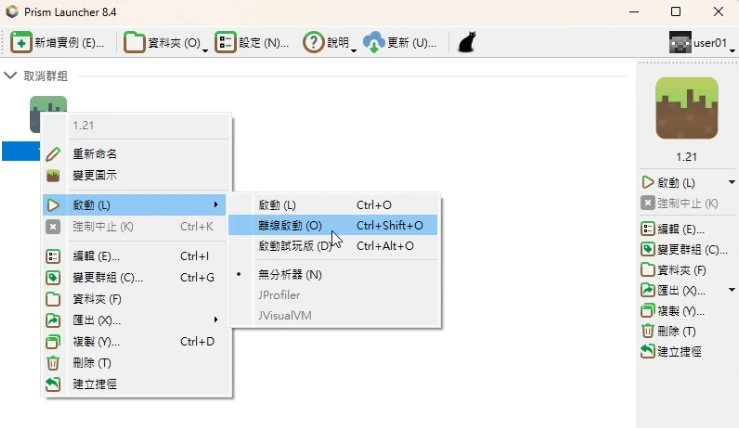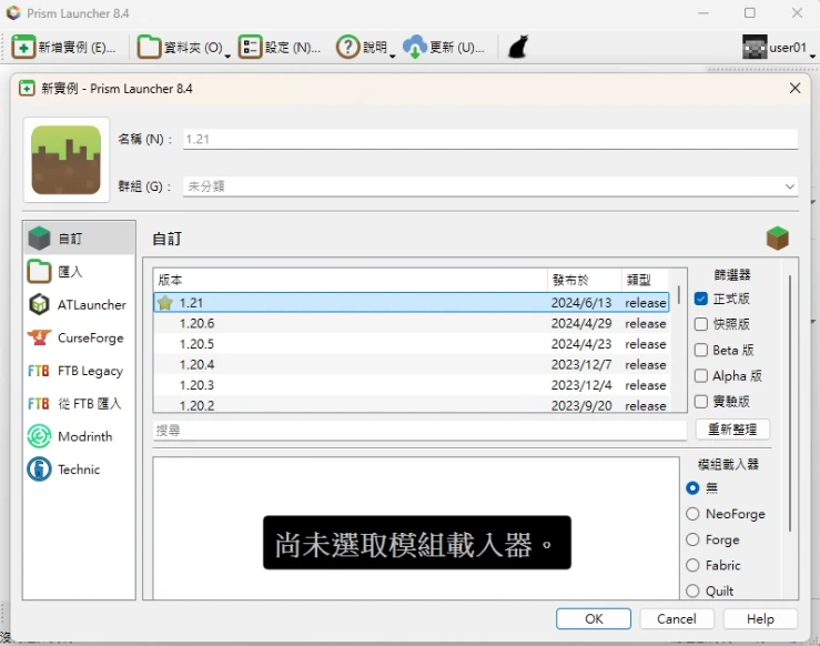 這樣就可以開始下載Minecraft了。例如要下載Minecraft 1.21,就是點選新增實例 → 選擇版本