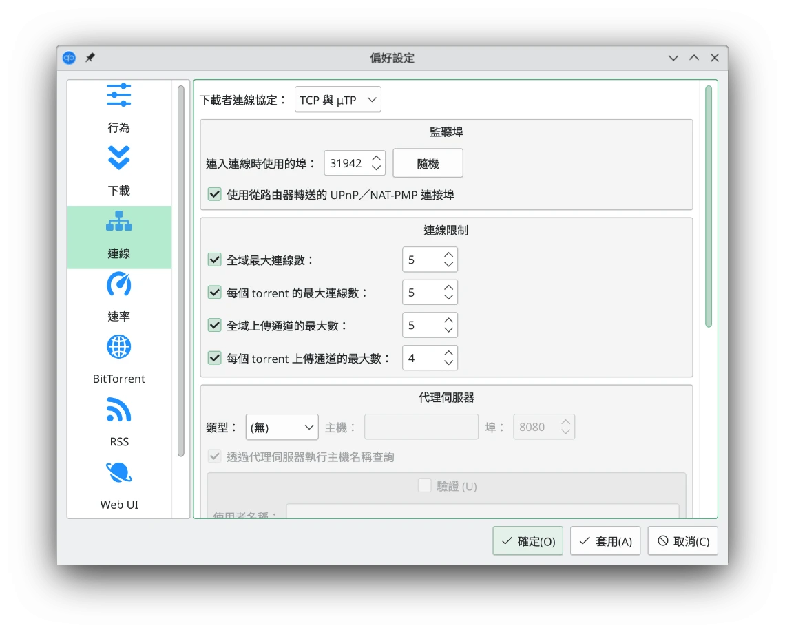 接著,點選連線,依照你的網速限制最大連接數,否則你的網路可能會被種子下載塞爆,CPU也會飆高
