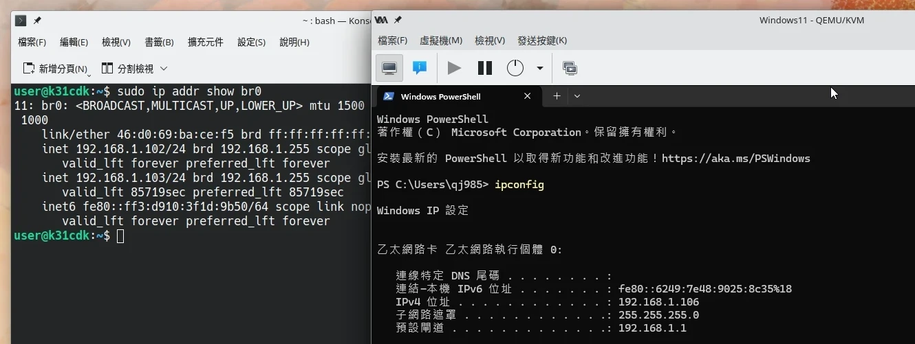 sudo ip addr show br0確認連線狀態
