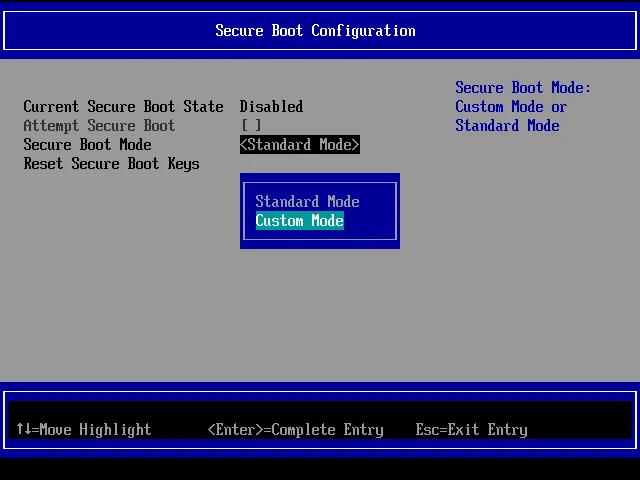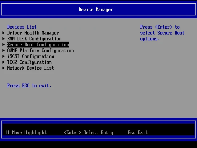 將虛擬機開機,滑鼠點一下讓QEMU吃到主機的滑鼠。按Esc進入BIOS,用鍵盤移動,進入Device Manager → Secure Boot Configuration